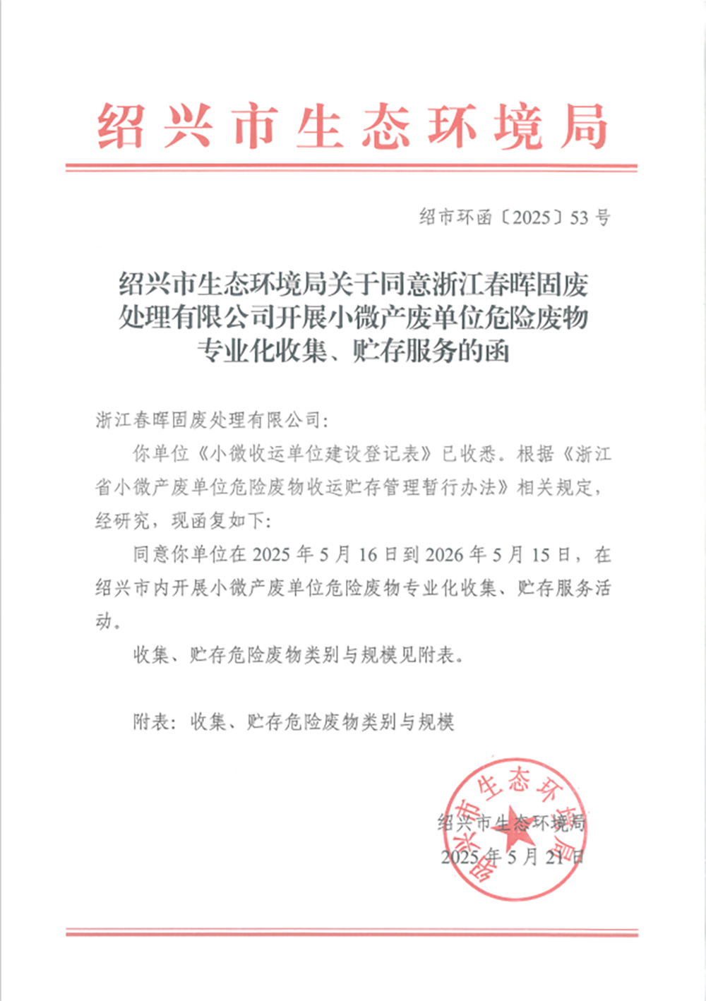 近日,春晖固废经过绍兴市生态环境局的审核批准,正式获得了覆盖绍兴市全域的危险废物小微收运资质,成为全市首家实现“全代码”覆盖小微收运服务的企业。这一举措标志着绍兴市危险废物管理向精细化、专业化迈出了重要一步,同时也为小微企业危废处置提供了更高效、合规的解决方案。